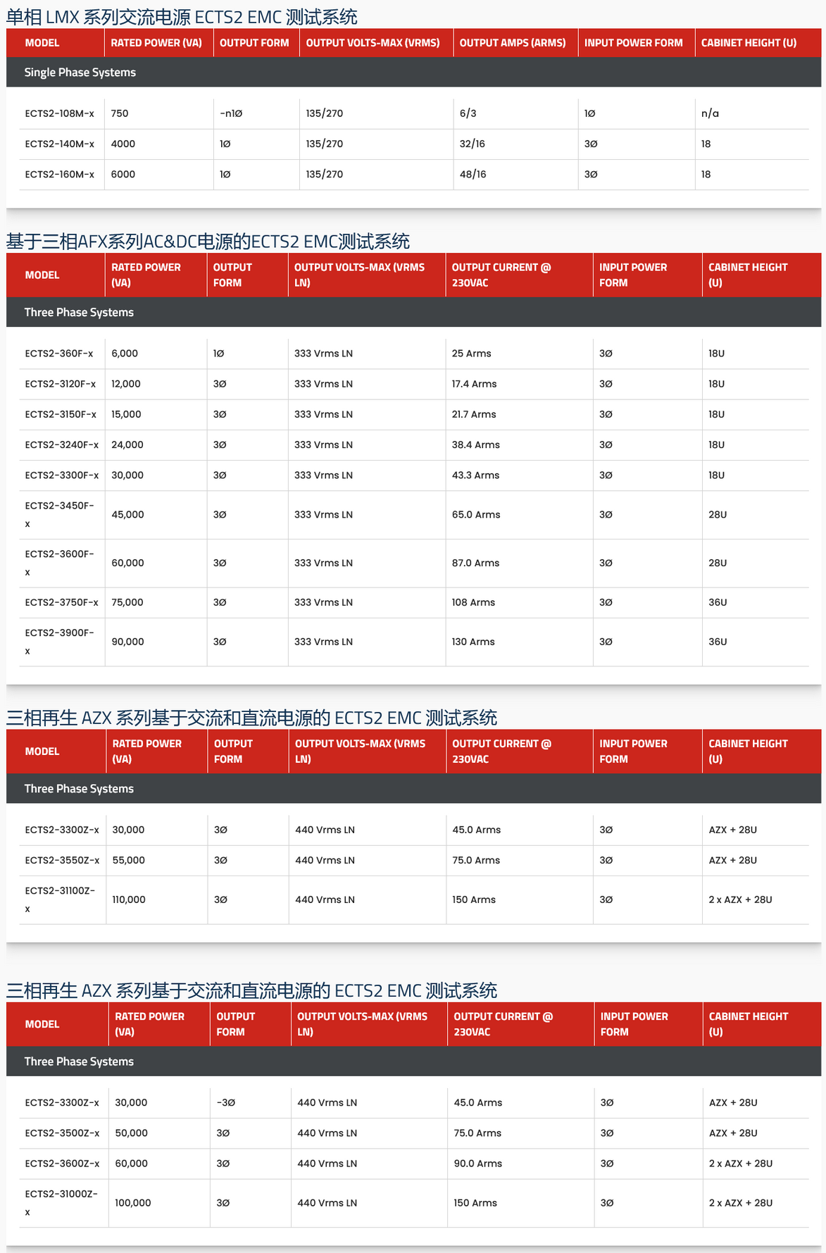 该系列由多种系统配置组成,可在 750VA 至 100kVA 的宽功率水平范围内进行单相和三相一致性测试。对于可以重新为交流公用电网供电的 EUT,建议使用基于 AZX 系列的 ECTS2-Z 型号。